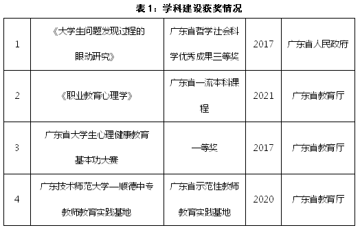 2020年,广东省中职学校心理健康教育与咨询专家指导委员会在我校成立,由校党委副书记李向明同志担任首届主任。2021年,《职业教育心理学》获批省级一流课程。近年来,教师团队主持省级职业教育心理研究课题5项;出版《职业教育心理学》《中职心理健康教育》等教材5部;积极参与职教师资培训,送教上门服务5000余名职校教师,多名教师被评为广东省职业院校送教上门培训优秀教师。