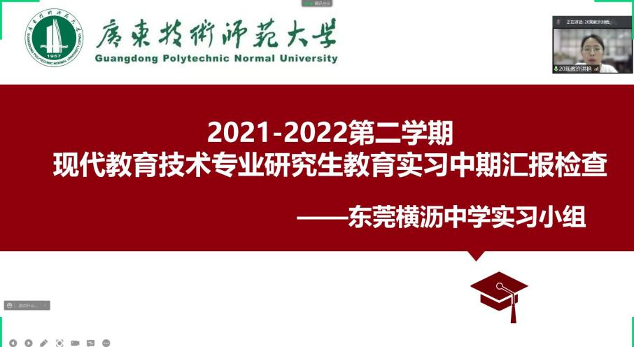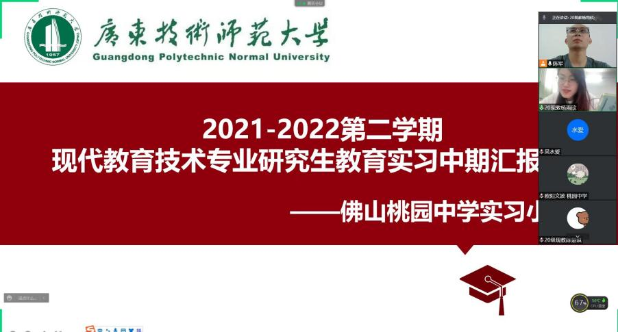 现代教育技术专业的线上中期检查汇报会于5月13日下午进行,学院分管研究生工作的陈丽君副院长,学院党委吴水爱副书记,研究生教学部梁碧珊主任,现代教育技术实习基地负责人陈军老师和佛山南海桃园中学孔见维副校长,欧阳文波老师,王敏老师以及东莞横沥中学的陈建平老师、肖春琳老师出席参加了现代教育技术专业研究生教育实习中期检查工作。
